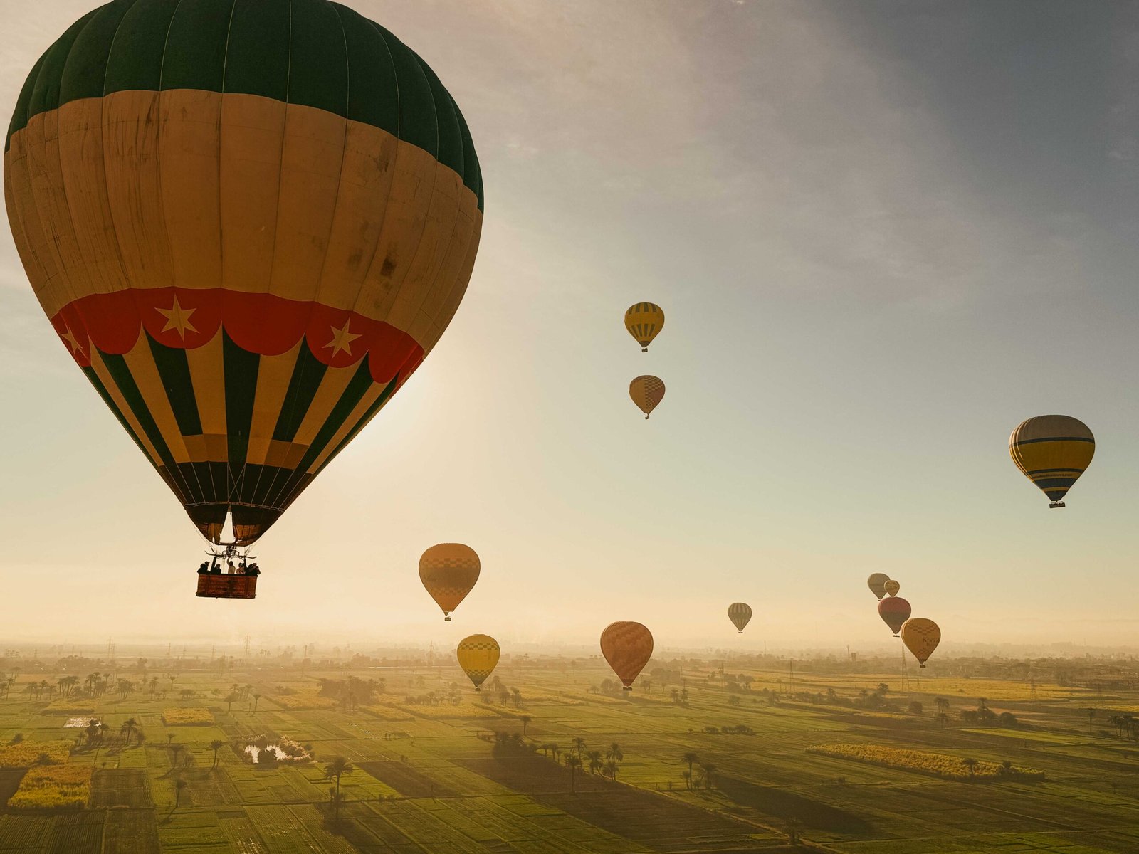 Começamos antes do nascer do sol com um passeio de balão de ar quente sobre a margem ocidental. Ver a primeira luz a atingir os campos e o deserto é algo que fica contigo durante muito tempo. É pacífico de uma forma que contrasta com tudo o resto no Egito.