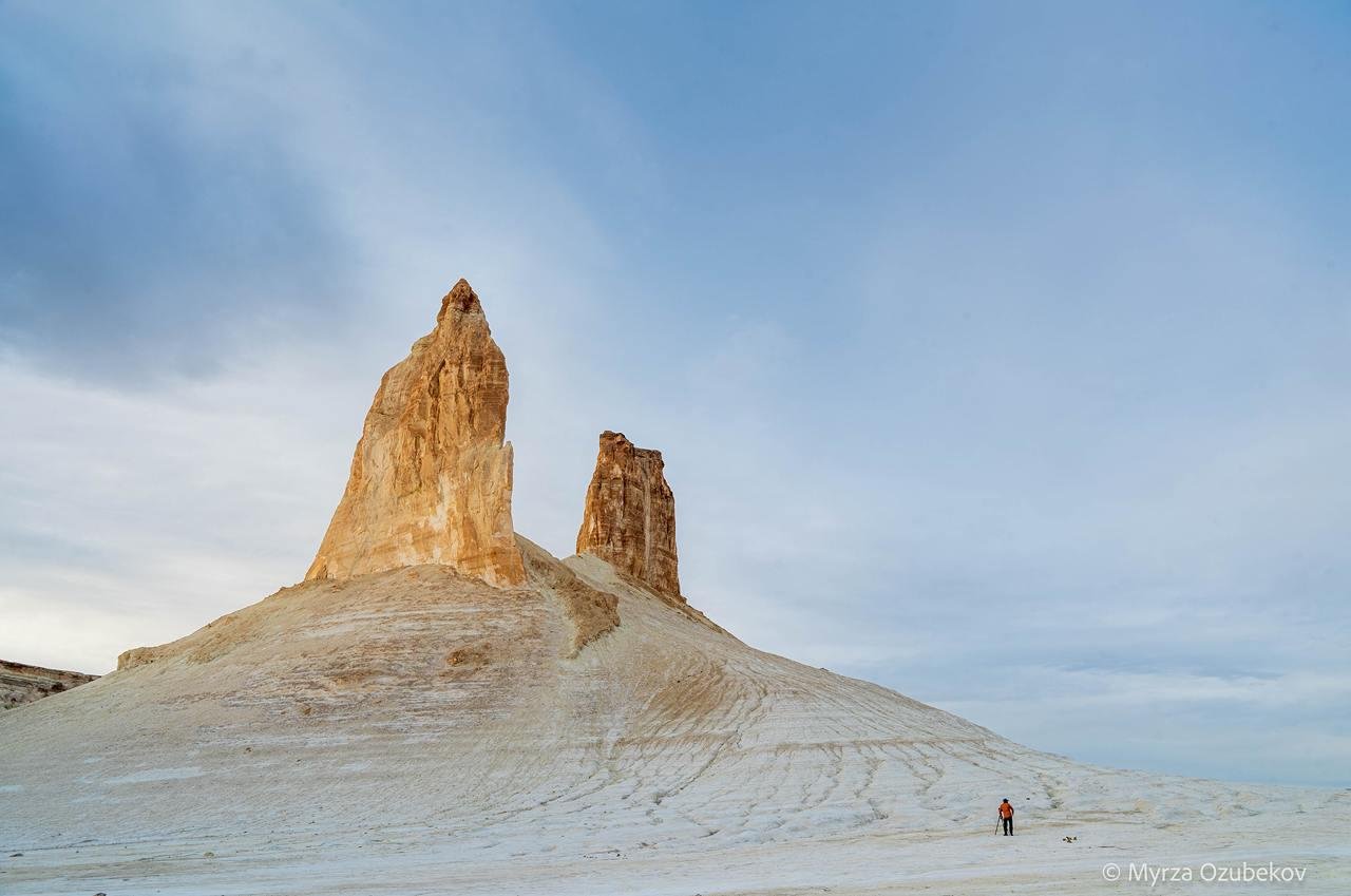 Hoje continuamos de jipe até à zona de Bozshira, uma das paisagens mais emblemáticas de Mangystau. A planície branca como a neve estende-se por baixo de picos rochosos que brilham ao sol, dando a todo o local uma sensação quase alienígena. Tudo isto faz parte do Planalto de Ustyurt, outrora o leito do antigo Oceano Tethys.