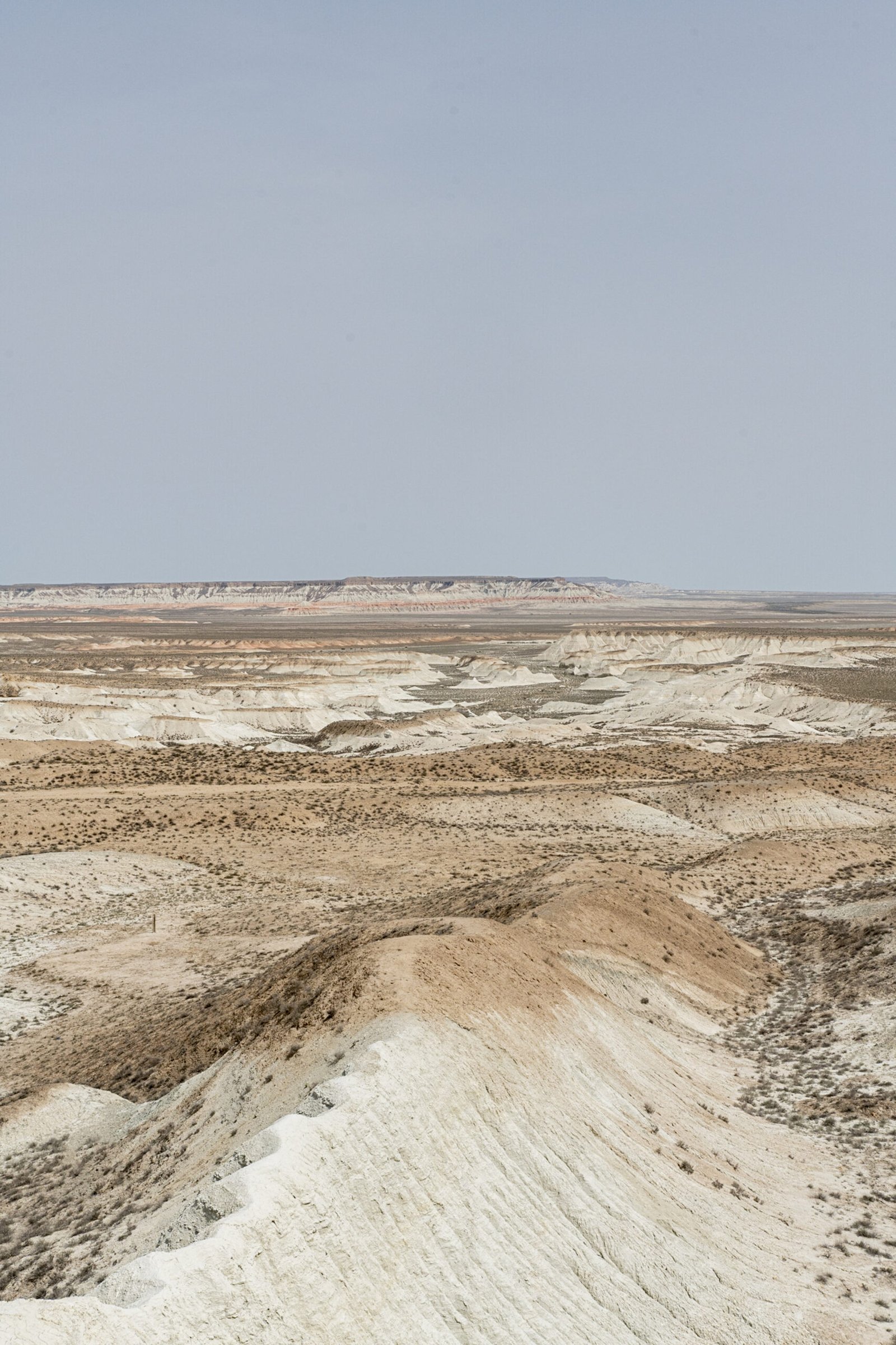 Conduzimos em direção aos altos miradouros com vista para as falésias de Bozshira, onde as formações de giz se precipitam num espaço aberto. As texturas e cores contrastantes – rocha branca pura, poeira pálida e horizontes sem fim – fazem desta uma das paragens mais memoráveis da viagem.