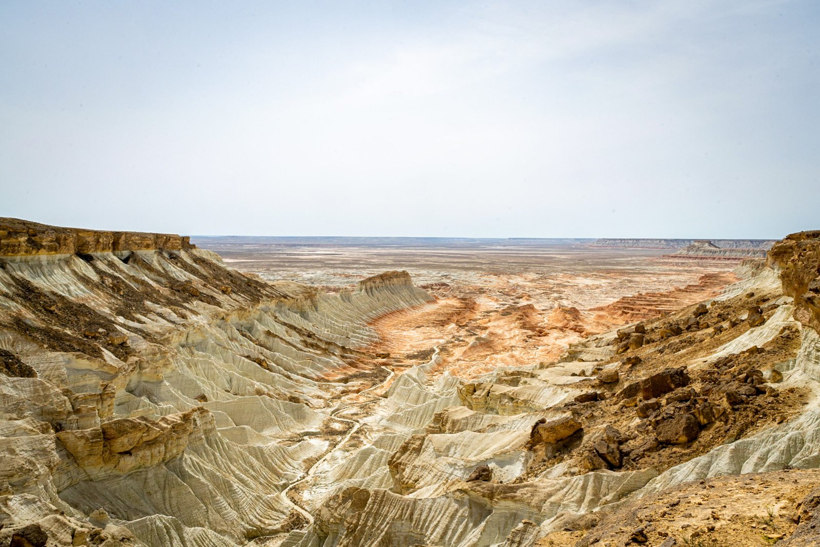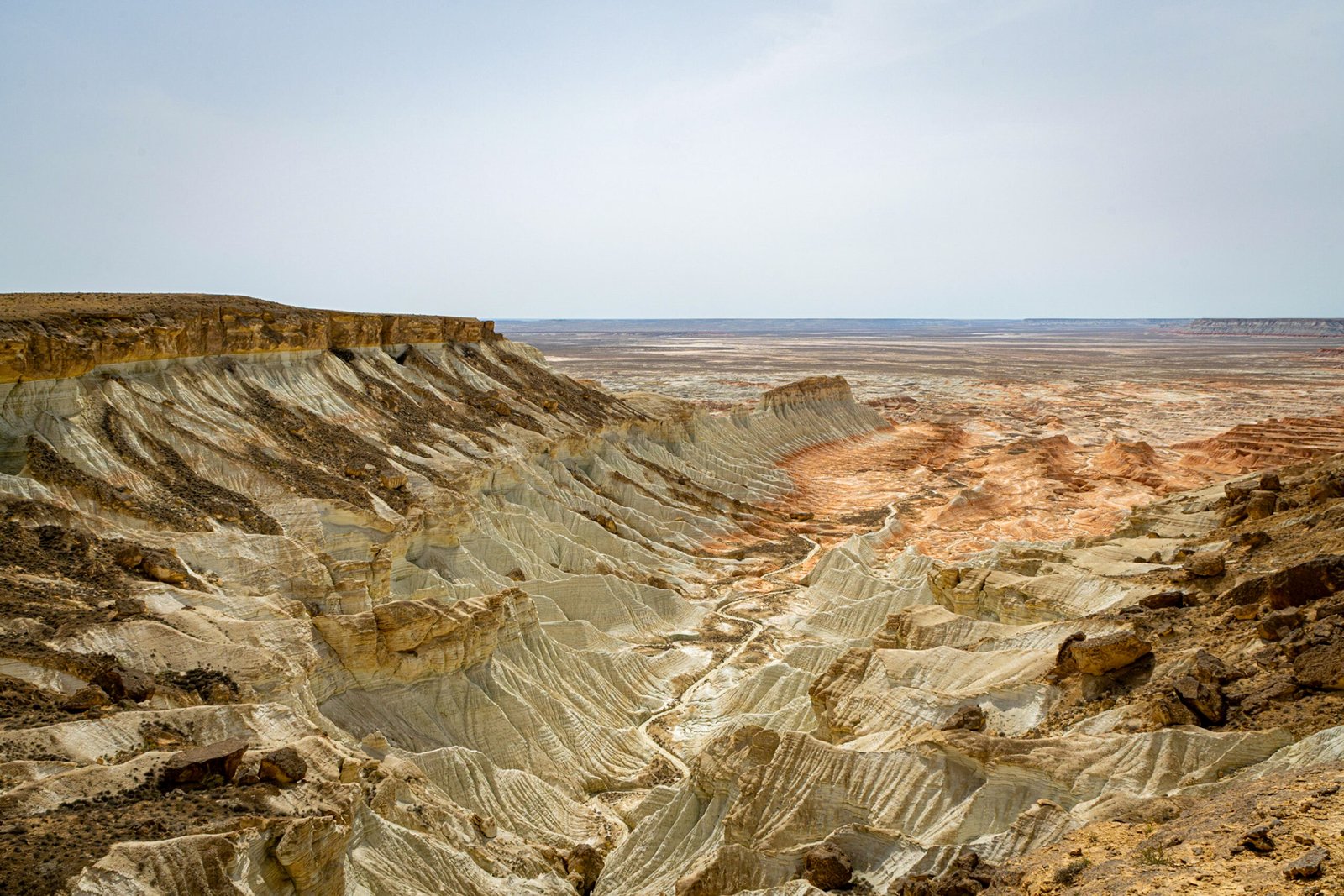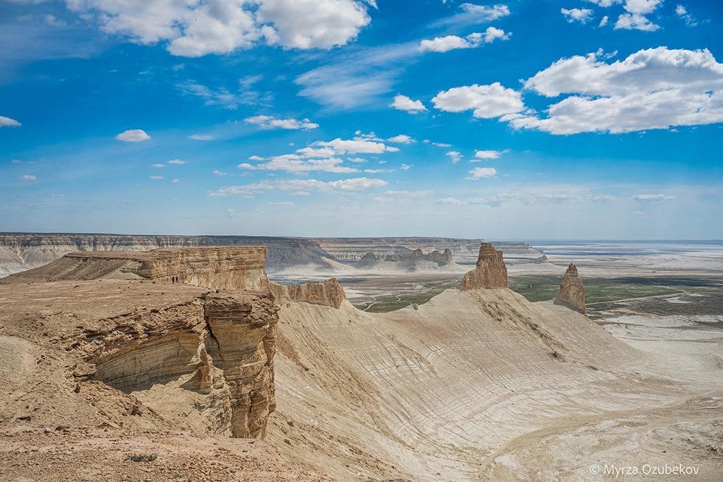 Conduzimos em direção aos altos miradouros com vista para as falésias de Bozshira, onde as formações de giz se precipitam num espaço aberto. As texturas e cores contrastantes – rocha branca pura, poeira pálida e horizontes sem fim – fazem desta uma das paragens mais memoráveis da viagem.