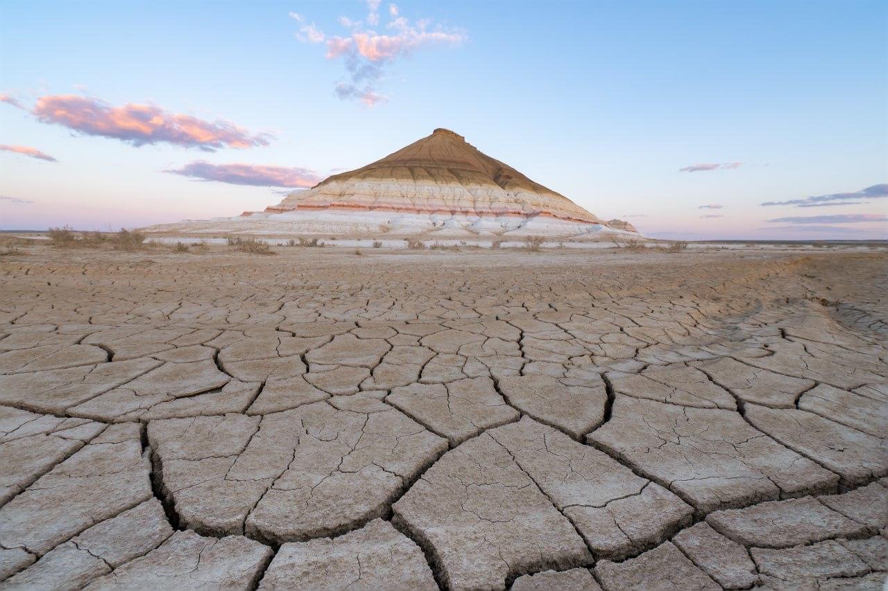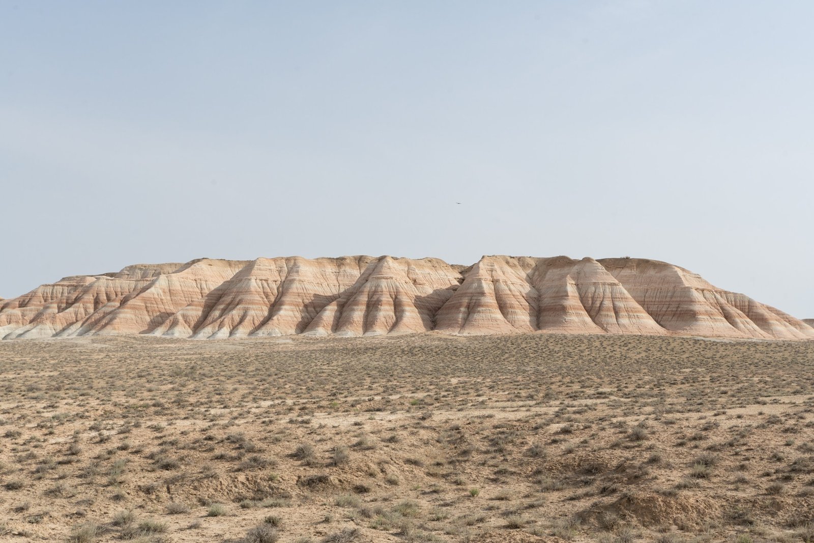 Quando saímos do acampamento, o Monte Bokty ergue-se à nossa frente – um pico cuja forma muda consoante a posição em que te encontras. Do sul, parece quase uma pirâmide. Continuamos em direção a Kyzylkup, uma formação com camadas de sedimentos branco-pálido e rosa suave que a fazem parecer uma fatia de mil-folhas de morango.