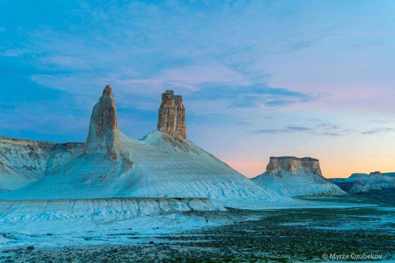 Hoje continuamos de jipe até à zona de Bozshira, uma das paisagens mais emblemáticas de Mangystau. A planície branca como a neve estende-se por baixo de picos rochosos que brilham ao sol, dando a todo o local uma sensação quase alienígena. Tudo isto faz parte do Planalto de Ustyurt, outrora o leito do antigo Oceano Tethys.