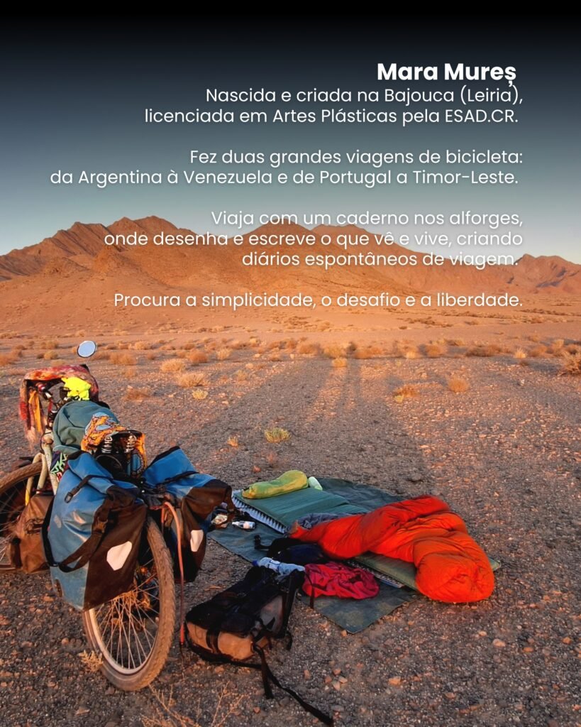 Joining the conversation is also Mara Mureș, a cycle traveller and illustrator who in 2025 pedalled from Bajouca to Timor-Leste and celebrated her birthday in Iran. A journey made with the body, slow time and a notebook in her panniers, where she draws and writes what she lives.